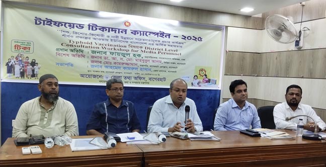 বাগেরহাটে টাইফয়েড টিকাদান ক্যাম্পেইন বিষয়ক জেলা পর্যায়ের পরামর্শমূলক কর্মশালা অনুষ্ঠিত হয়েছে। বুধবার (২৪ সেপ্টেম্বর ২০২৫) দুপুরে জেলা তথ্য অফিসের উদ্যোগে বাগেরহাট প্রেসক্লবের সম্মেলন কক্ষে এ কর্মশালার আয়োজন করা হয়। ভার্চুয়ালি যুক্ত হয়ে এই কর্মশালার উদ্বোধন করেন,গণযোগাযোগ অধিদপ্তরের মহাপরিচালক  ফায়জুল হক।