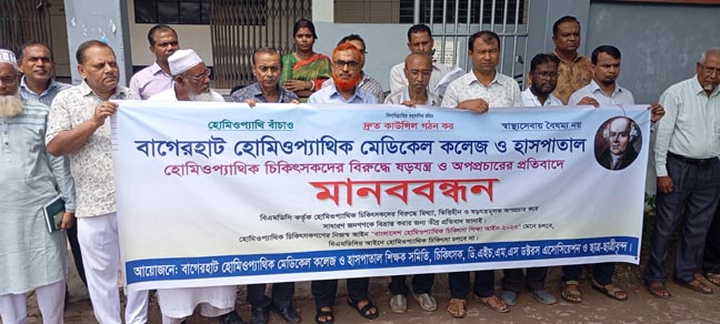 হোমিওপ্যাথিক চিকিৎসকদের নামের পূর্বে “ডা.” পদবি ব্যবহারে নিষেধাজ্ঞার প্রতিবাদে বাগেরহাটে মানববন্ধন কর্মসূচী পালন করা হয়েছে। সোমবার (১ সেপ্টেম্বর) সকালে বাগেরহাট হোমিওপ্যাথিক মেডিকেল কলেজ ও হাসপাতালের সামনে মানববন্ধনে শিক্ষক, চিকিৎসক, ডিএইচএমএস ডিগ্রিধারী এবং শিক্ষার্থীরা অংশ নেয়।